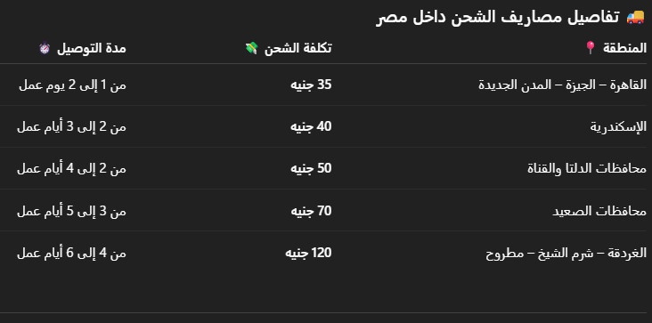 - في بعض الحملات أو العروض، قد يوفر المتجر شحنًا مجانيًا عند تجاوز حد معين من المشتريات (مثلاً 1000 جنيه مصري).