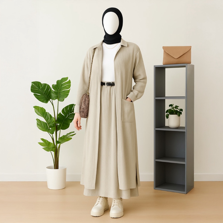القطعة الخارجية الطويلة تُضفي لمسة فخامة محتشمة،