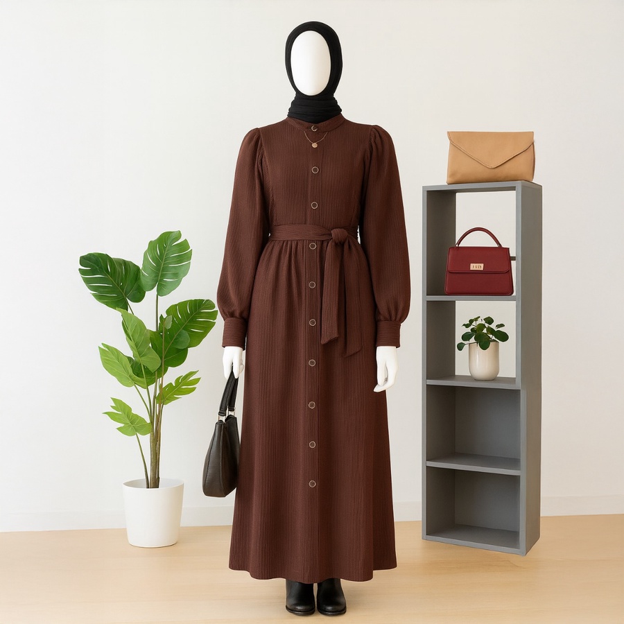 يأتي بخامة ريب مضلع قطيفة تمنح ملمسًا ناعمًا وانسيابية دافئة، مع أزرار أمامية كاملة تضيف طابعًا كلاسيكيًا متزنًا، وحزام خصر يبرز القوام برُقيّ طبيعي.